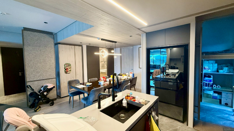 高樓層視野無遮蔽,山景河景一次擁有,邊間三面採光、三主臥設計,約定專用約18.11坪露台,破千萬裝潢,有傭人房