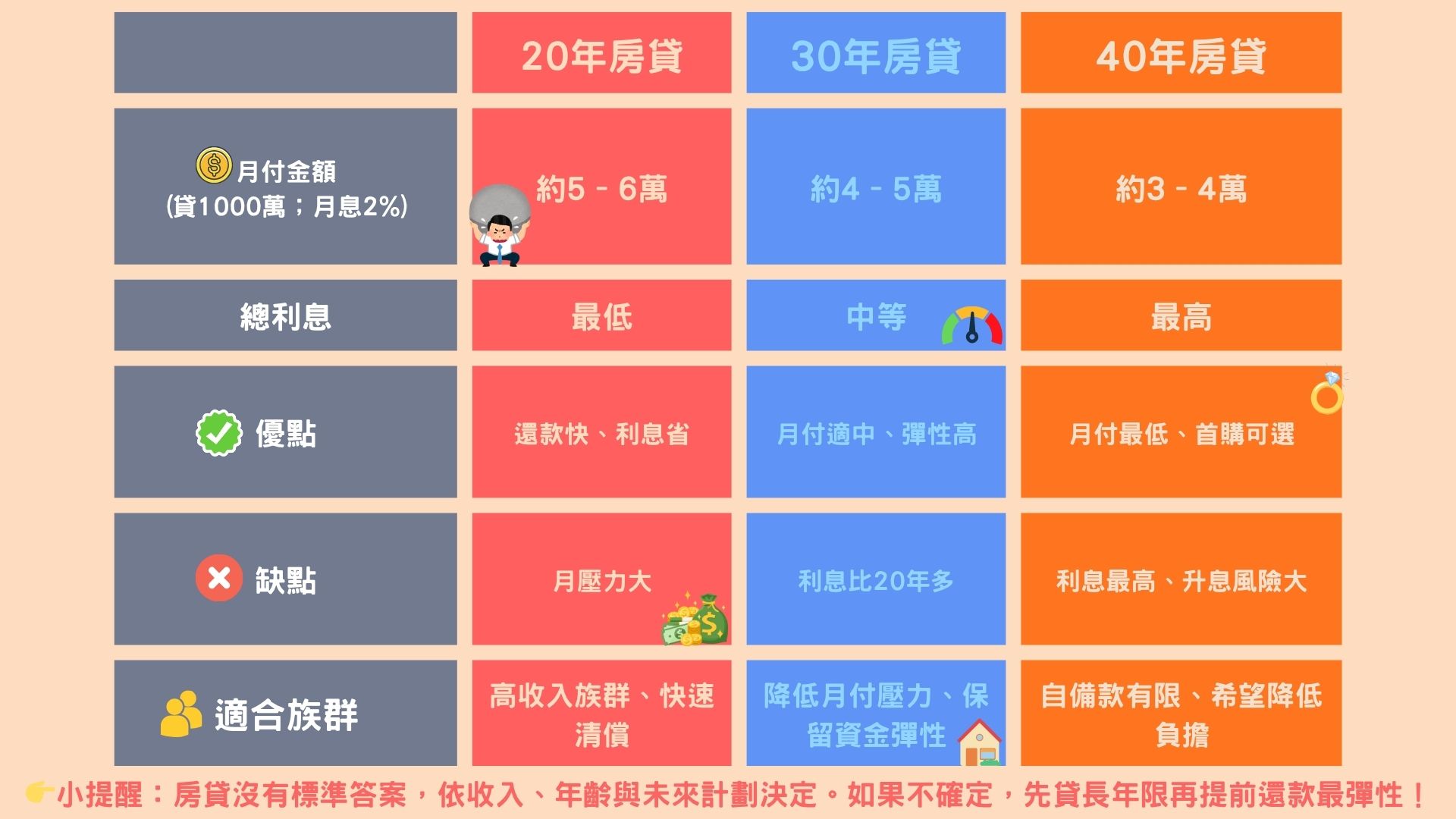 如果不確定,先辦長年限(30年或40年),再透過提前還款調整,是最安全也最彈性的方式。